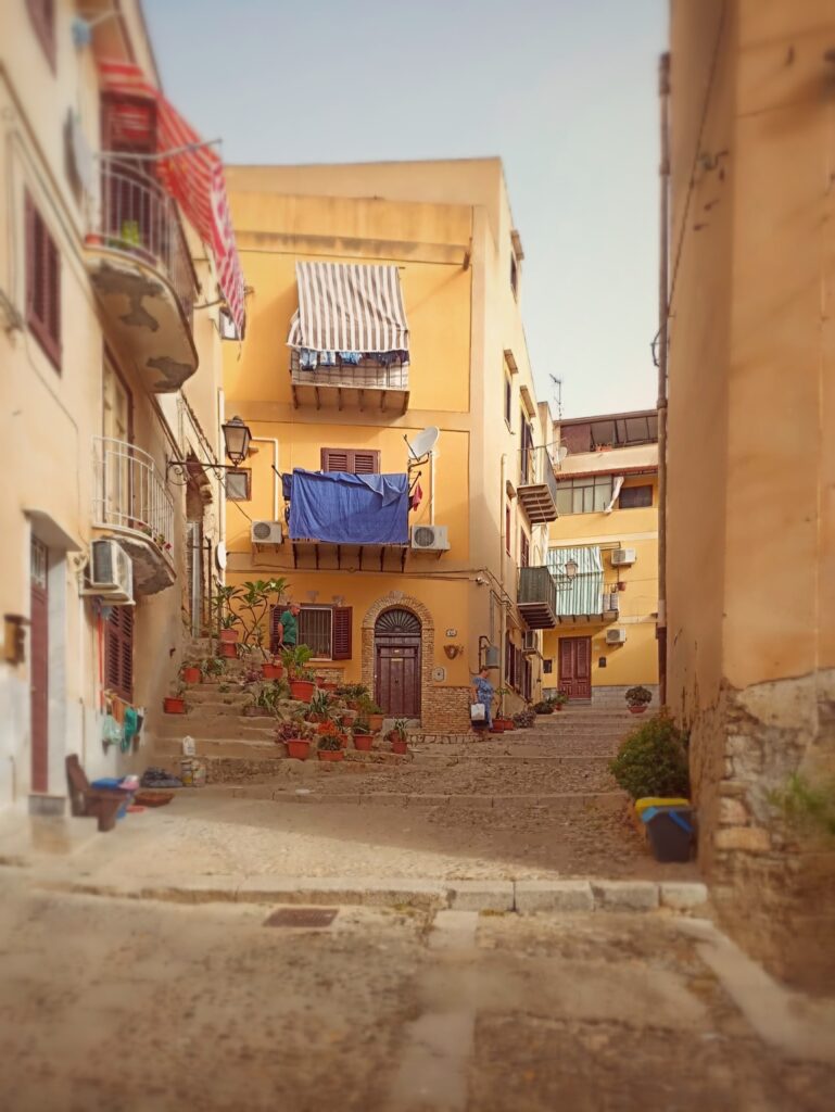 Termini alta è altra storia. L’aspetto urbano è quello di una classica città di mare abbarbicata su uno sperone di roccia, con viuzze e interminabili scalinate strette e talvolta ripide. Un dedalo di stradine lastricate a porfido, difficilissime da tenere pulite. Poche strade possono essere percorse in auto, tanto che Sissi spesso ha detto “ma come fa un anziano a vivere qui?”. Effettivamente arrivare a piedi in cima a Termini Alta è una scarpinata non banale, alleggerita dalla meraviglia rappresentata da scorci davvero suggestivi. E fin qui a qualcuno potrebbe sembrare un luogo troppo ostico da visitare. Quel che davvero cambia le carte in tavola è la gente. Quando cala la sera trovi le famiglie che si riversano nelle stradine e fanno “trebbo” sugli scalini di casa. Bambini che giocano sulla via, le donne sulle sedie o sugli sdraio che si godono il fresco. Ti salutano mentre passi, ti augurano una buona serata, anche se non ti hanno mai visto prima. Qualche anziano affacciato sulla porta che fuma una sigaretta e gli stendini dei panni fuori all’aria aperta. Mentre si passeggia un gatto steso su un gradino dorme. Normalmente non ci faresti caso, invece qui diventano rilevanti anche loro, come se fossero parte integrante dell’architettura urbana, insieme ai vasi di fiori e erbe aromatiche che arredano in maniera disordinata le vie e gli onnipresenti balconi. Dall’alto i sacchi dell’immondizia vengono calati per essere ritirati la mattina presto e rimangono appesi alle finestre e ai balconi. Qui anche il pattume diventa un elemento decorativo.